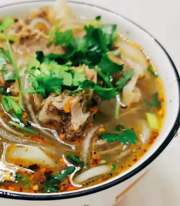 在浓郁奶白的羊汤里,加入切好的肉片、粉条和白萝卜,让羊肉和粉条充分吸收羊汤的鲜味,最后撒上香菜和葱花,色香味俱全。再把稍微硬一点的馍泡进去,不一会儿就吸满了汤汁。