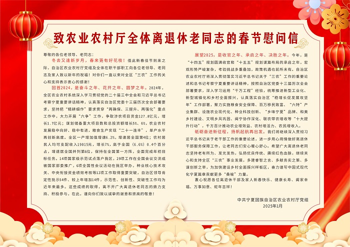 岁寒情暖,慰问情浓。为切实弘扬尊老、敬老的传统美德,表达对离退休老同志的关怀与敬意,在2025年新春佳节来临之际,三级片 组织开展“新春走访送温暖、佳节慰问暖桑榆”活动。由厅领导和机关各处(局、办)主要负责人带队组成35个慰问组,对厅机关250名离退休人员、4名生活困难党员、4名困难职工、9名离退休干部职工遗孀和3个派驻驻村工作队及每村3户困难群众进行了走访慰问或电话慰问,给每位离退休老同志发放一封慰问信,简要通报2024年全区农业农村工作取得的成绩及2025年工作打算,并向他们转达党中央、自治区党委政府及厅党组的关怀,送上了诚挚的新年祝福。