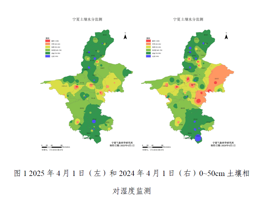 据4月1日土壤水分自动站监测数据显示(图1):灌区和南部山区大部分地区0~50cm土壤相对湿度在60%以上,土壤墒情为较适宜~适宜,可以满足玉米播种水分需求;中部干旱带大部地区0~50cm土壤相对湿度在60~70%,土壤墒情较适宜,可以满足玉米播种水分需求;沙坡头大部、中宁中部、红寺堡西南部、盐池西南部、同心东北部土壤相对湿度不足60%,局部低于40%,无法满足玉米播种的水分需求(图1)。与去年同期相比,中部干旱带土壤墒情好于去年同期。